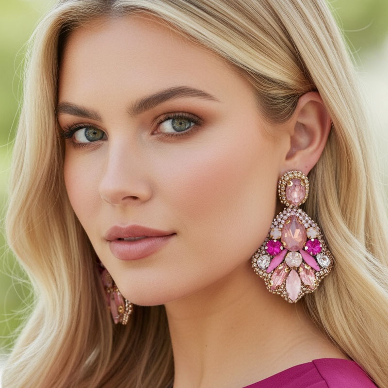 Handmade Lightweight Pink and Green Crystal Statement Earrings