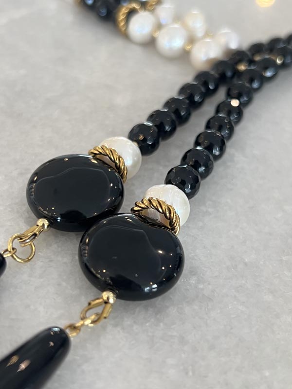 Handmade Multi-strand Onyx statement necklace combined with fresh water pearls and gold plated elements